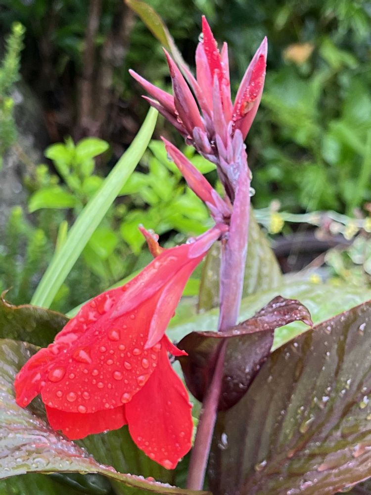 ③④銅葉の赤いカンナも花びらの雨粒が重いよ