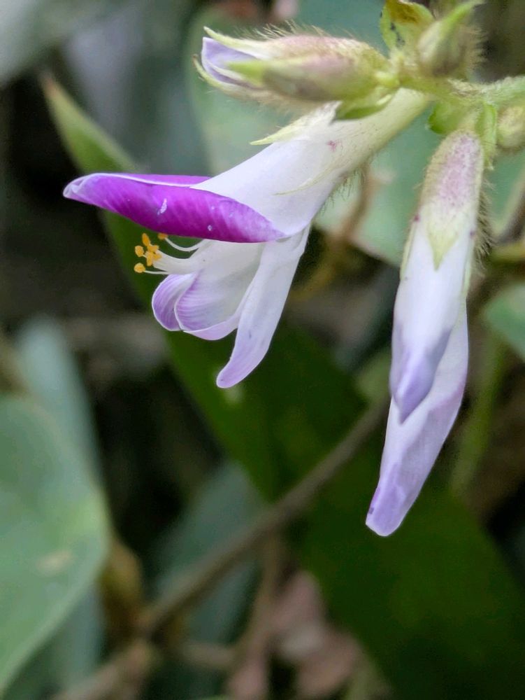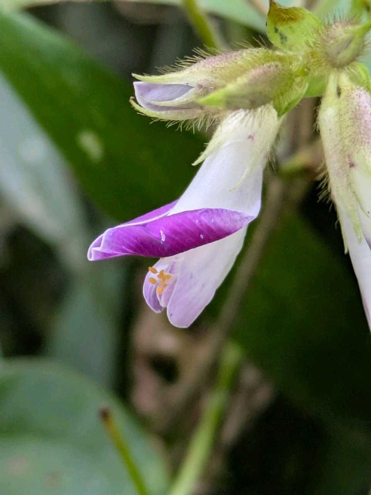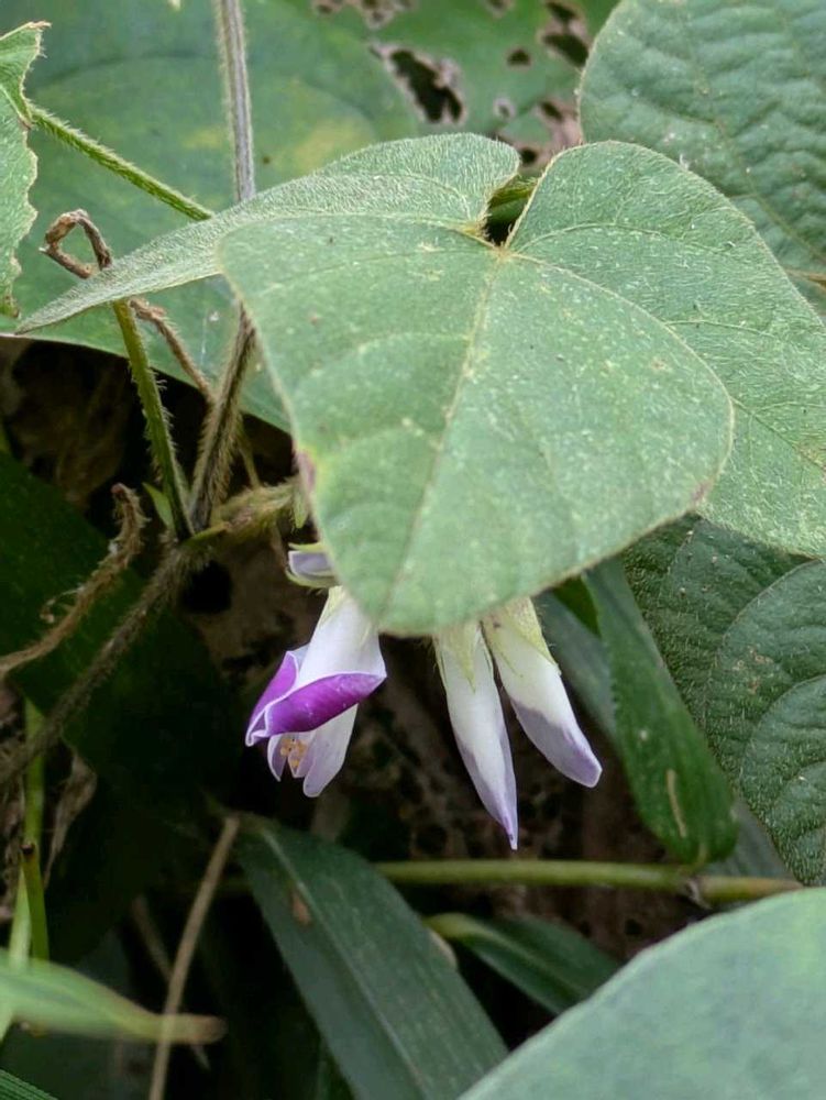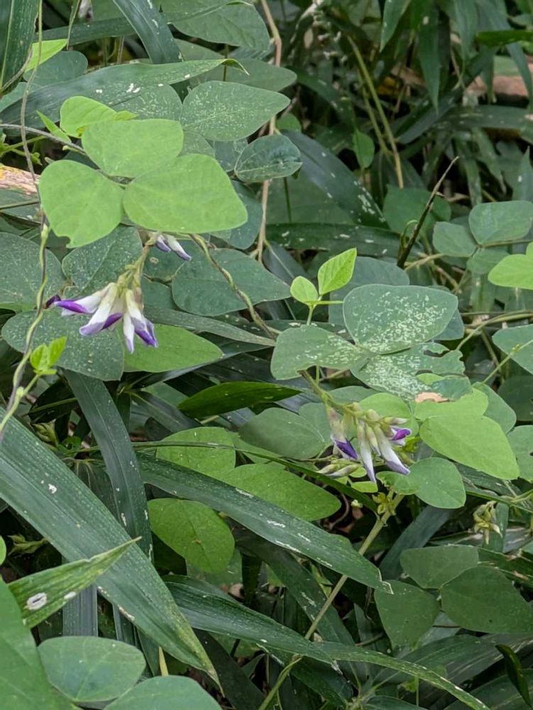 諦めて林の中へ~しゃがんでキバナアキギリのお花でちょっと遊んでから…視線をあげると、葉陰にヤブマメの花が、咲いていました‥💓オシャレ!!