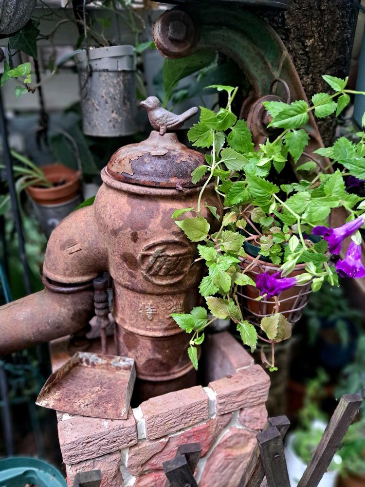 さん。井戸のポンプ大好きでいくつかあります。こちらは本物の上のポンプのみで中に水がたまってしまうのでちょうど良いのがあったので蓋にしてみました✨