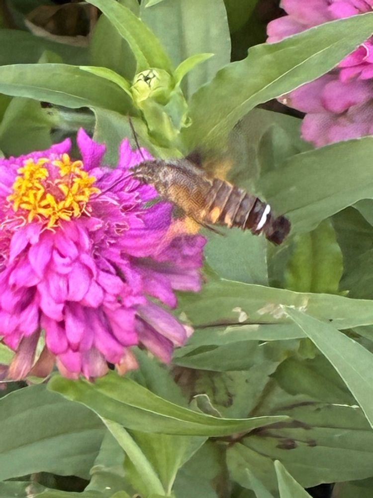 夕暮れ時、道路沿いの花壇にて「ジニア」と食事に来た「ホシホウジャク」さんをパチリ!📸🩷🌿🐝😋😊😄🌇👌