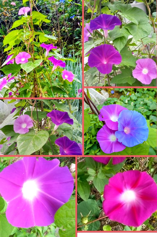 支柱の朝顔は青紫でしたが、後からピンク色の花がさきました。