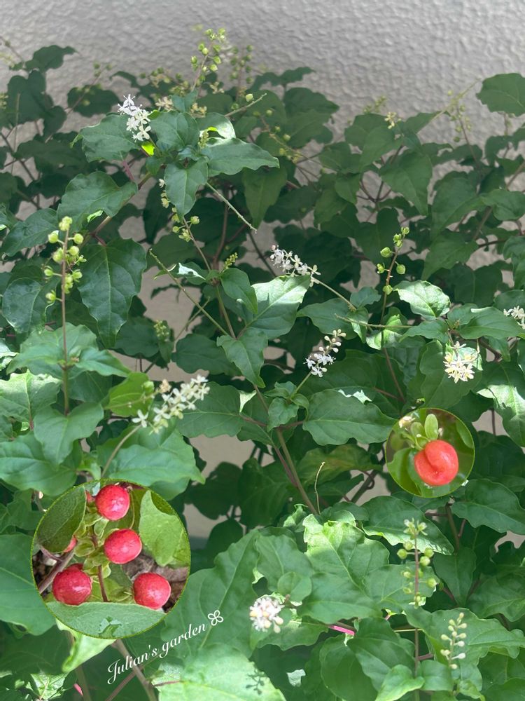 ②こぼれ種であちこちからジュズサンゴが出ていて 他で赤い実もなっています🔴