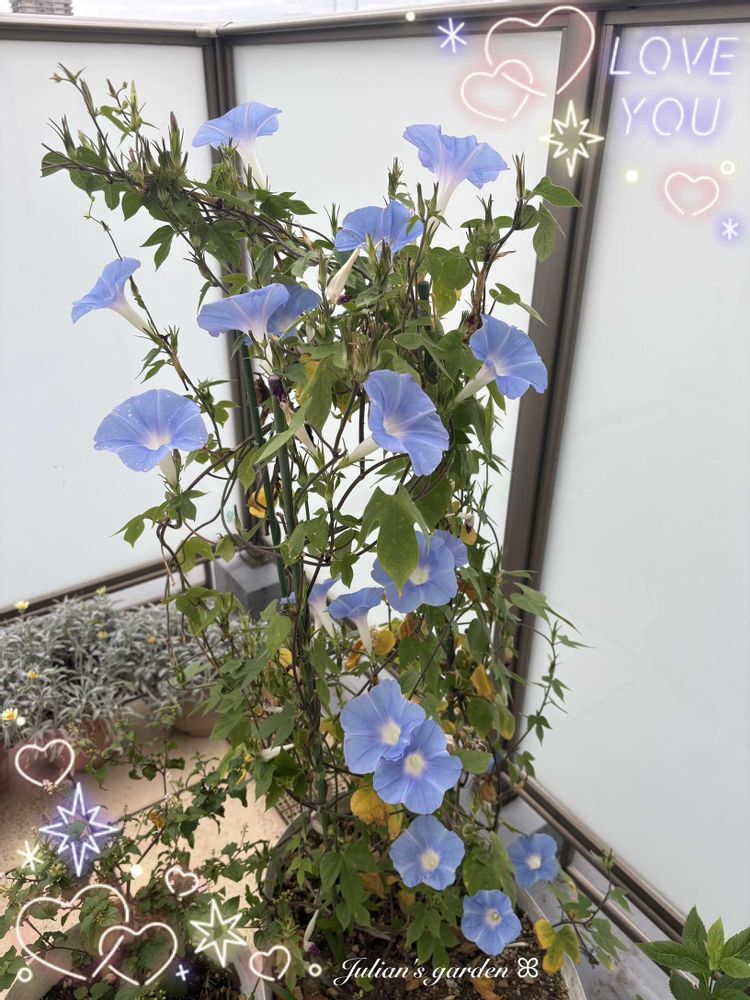 ④こぼれ種からのアサガオが涼しくなってからか?小玉スイカの蔓を抜いたせいか 沢山咲いてくれてます🩵