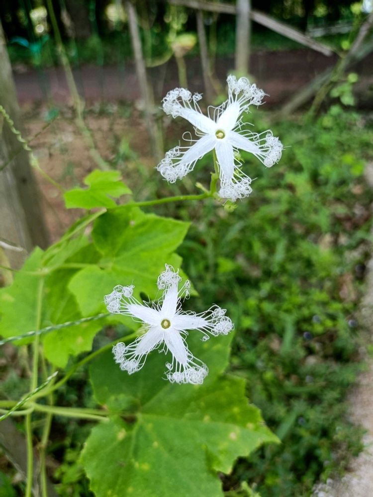 カラスウリに似た白い花が葉腋に咲き、花冠は5つに裂け、 裂片の縁が糸状に裂ける。花冠は4裂や6裂することもある。