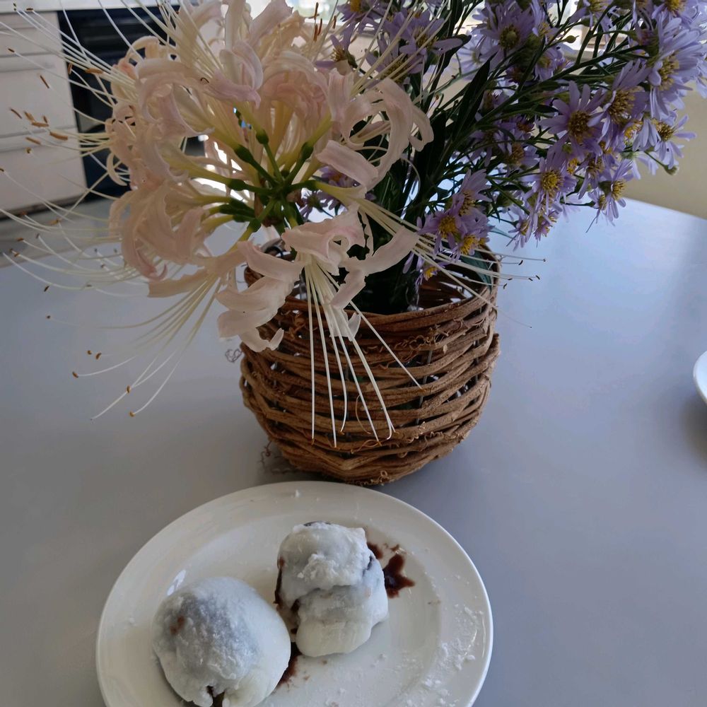 4️⃣ブドウ大福を作って背景にリコリスとシオンです✨