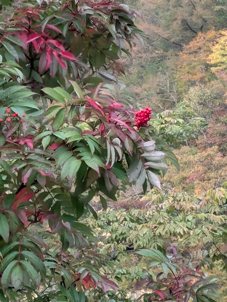 ①ナナカマド(大山山麓24/11/4)②紅葉ナナカマド(低山 24/11/10)③ナナカマドの花(25/5/5庭)④今朝庭⑤豆梨(公園)