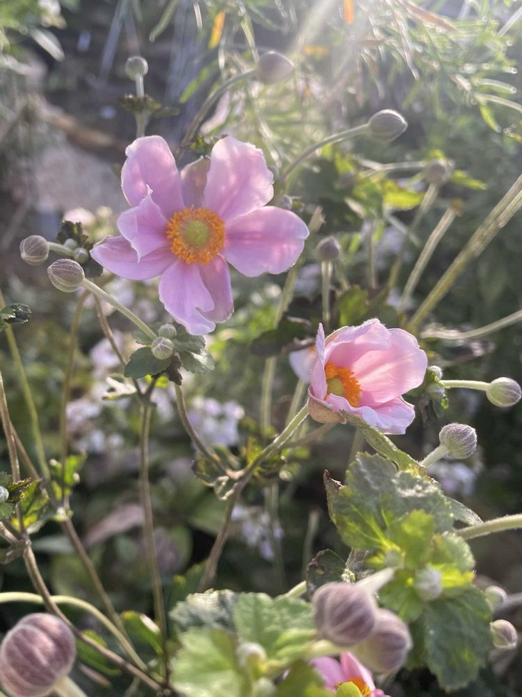 シュウメイギク、地植えにしたら、昔はこんなふうに咲かせられたのに、なぜかここ数年よく枯らします😂