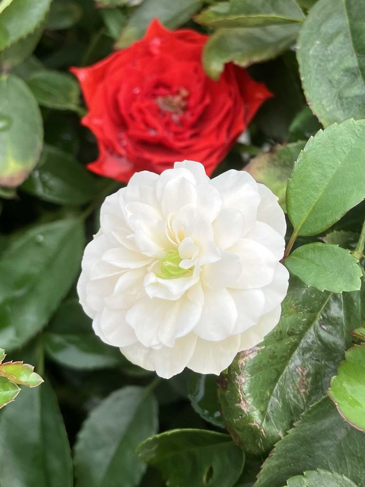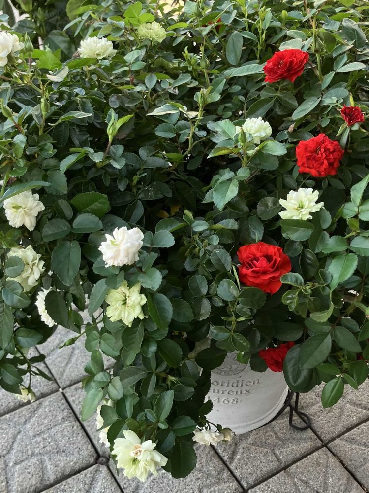 🛒スーパーのロピアで購入した赤いミニバラ(名無し)とカインズで見切り品のグリーンアイスを一緒に植えてます🤭