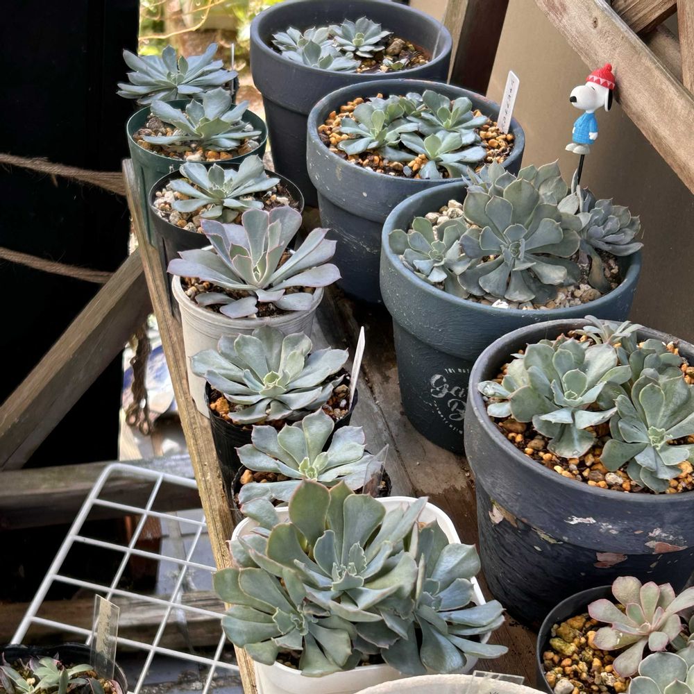 玄関前のシャビアナ、デザートスター、ネオンブレーカーズの葉挿しっ子たち。おひとり様仕立てが場所問題の関係で困難でもう、丼にしちゃえって感じ🤣