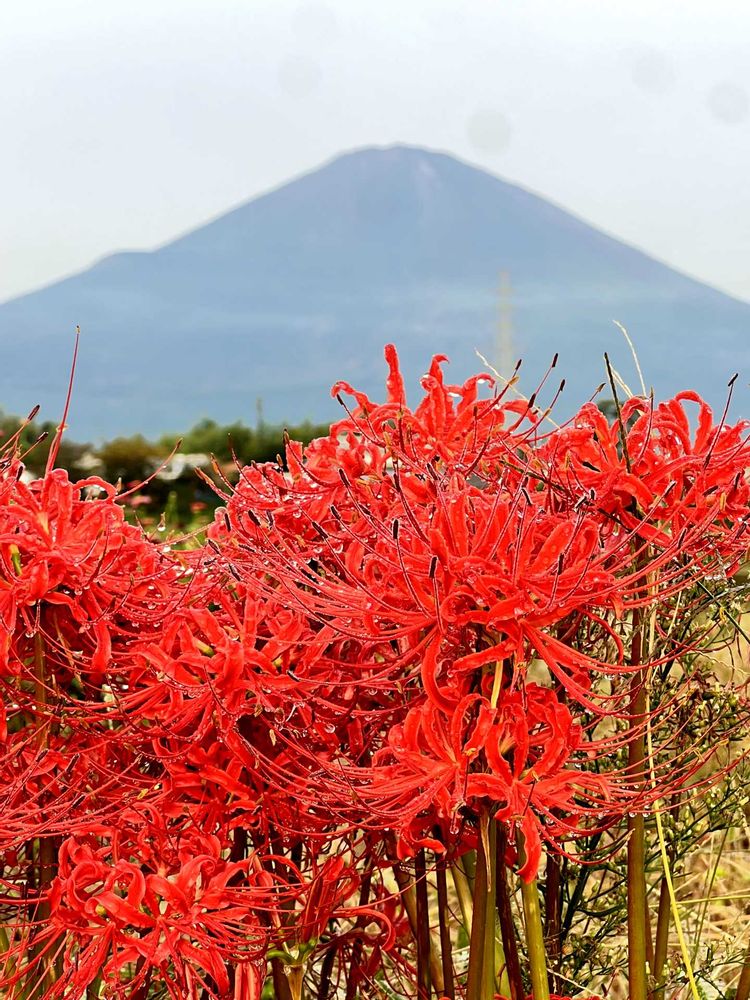 今朝の富士山と雲、靄、ススキ、秋桜、彼岸花