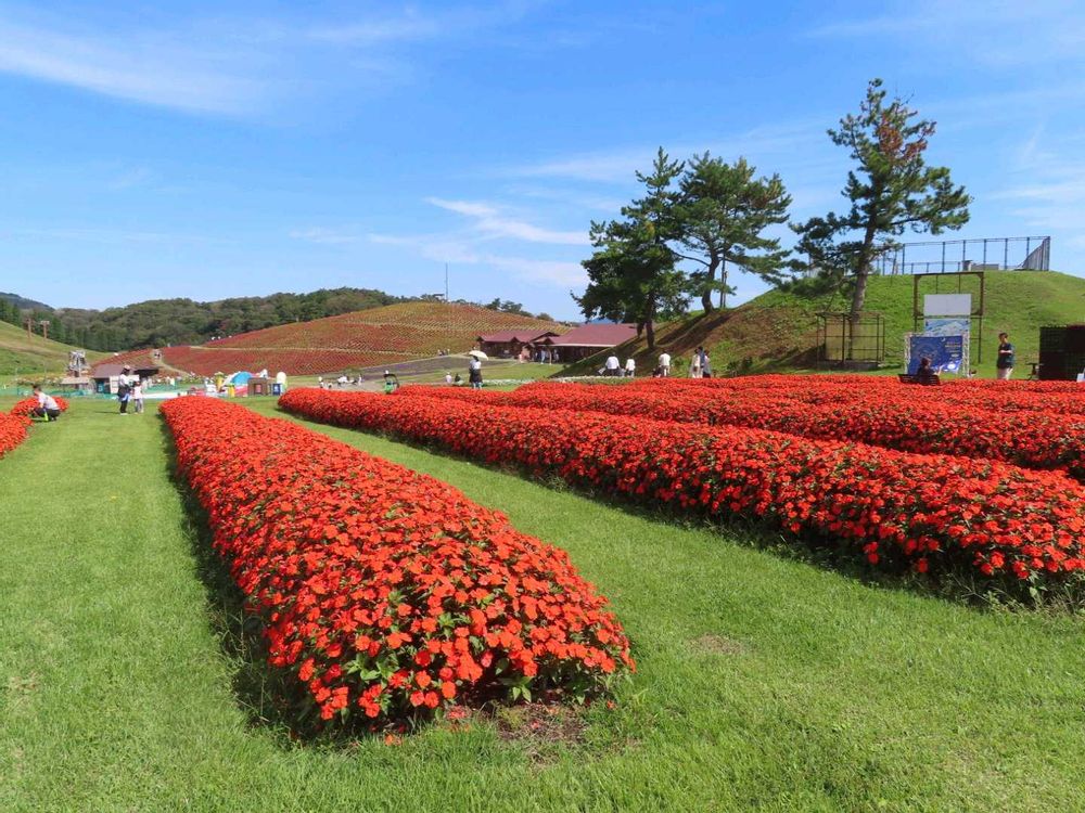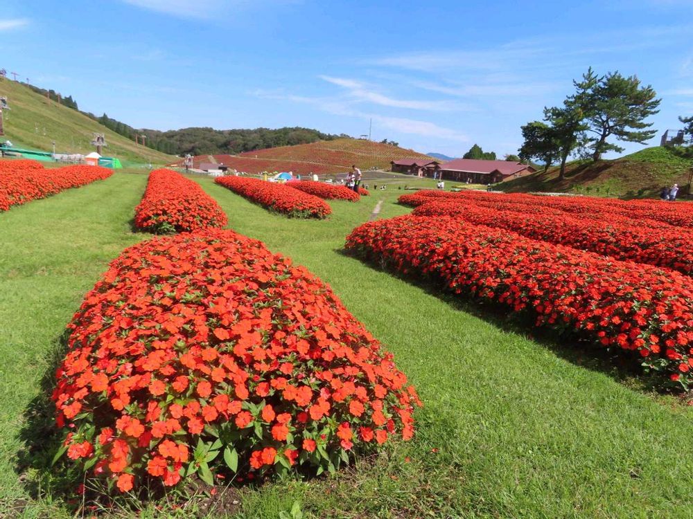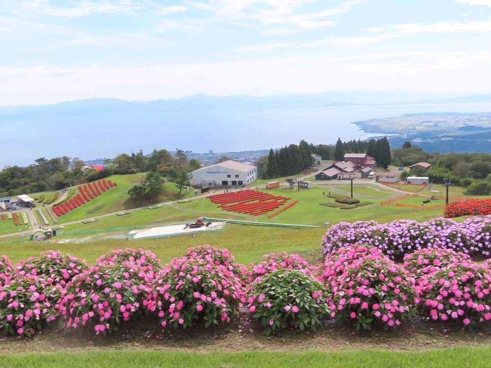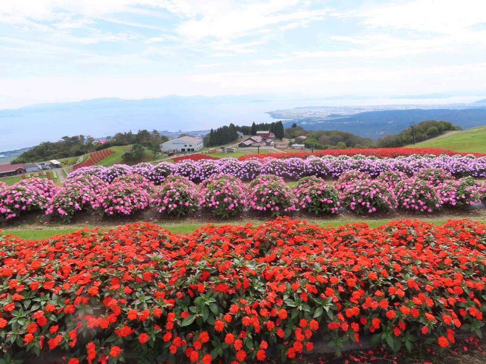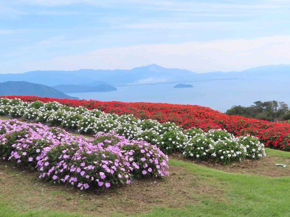 赤を中心にピンクや白のサンパチェンスが咲き揃い、琵琶湖を臨む景色はまさに絶景でした。