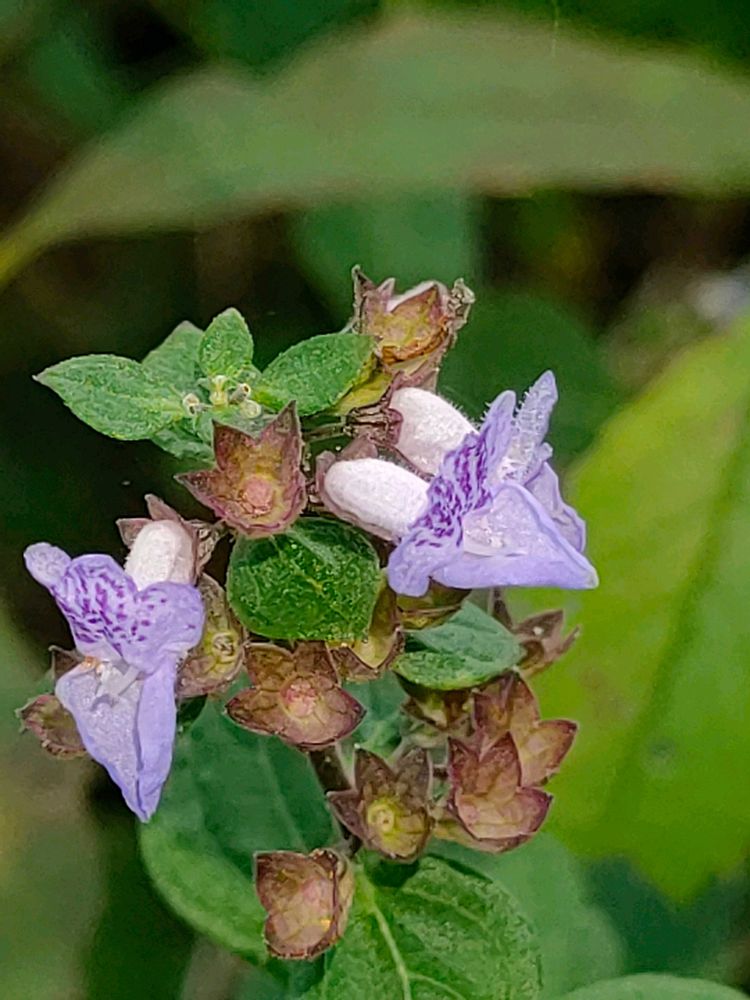 ✽花はまばらにつき花冠は2唇形で、上唇は4裂して筋状に斑点が入り立ち上がる、下唇は2裂して前に突き出て内側に巻く