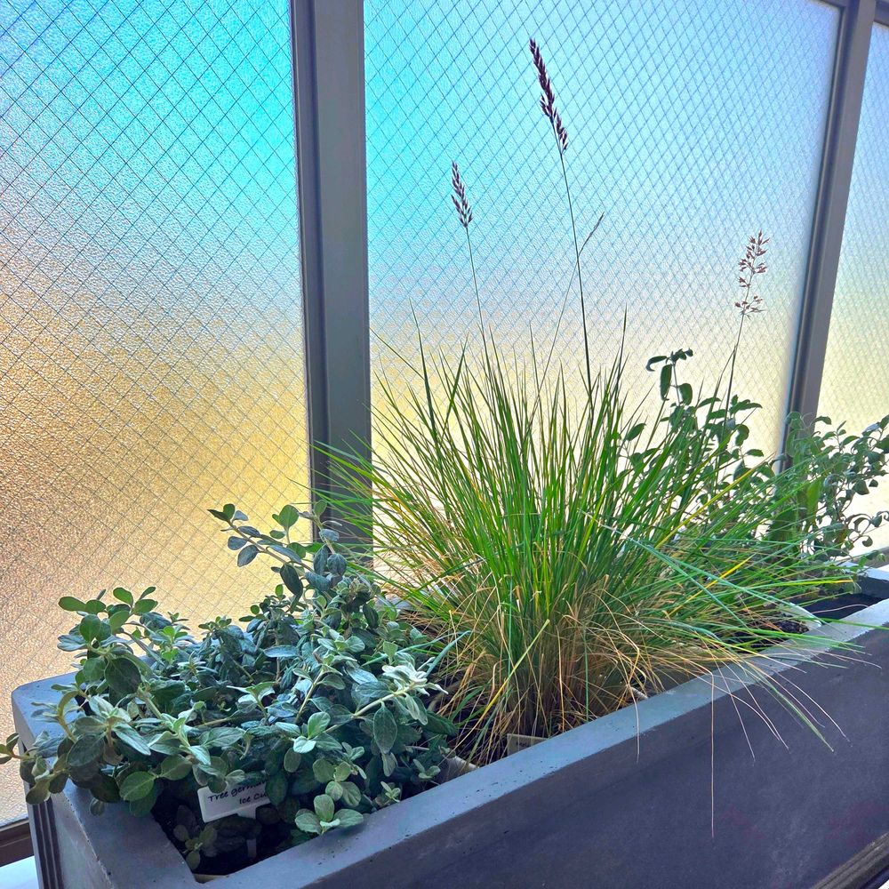 焼けてしまう愛らしい花*花は卒業。グラス類がとにかく丈夫で!夏を生き抜き、どれもひとまわり大きく育ちました。華やかさはゼロですが、こんな渋めも年相応かなと♡