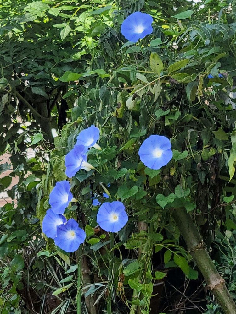 可愛いアサガオちゃん💙💙💙💙💙💙💙🌿 皇帝ダリアのところにたくさん咲いてて、気持ちいいですねー😊