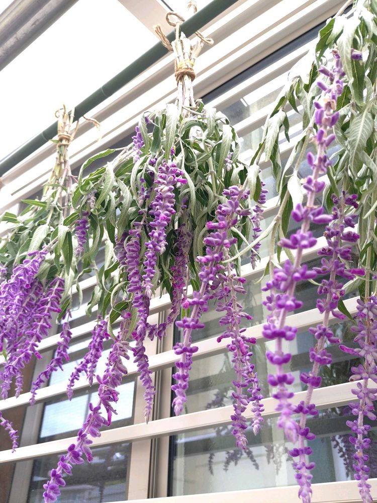 今年はドライフラワーにしようかと、軒下に吊るしました💜