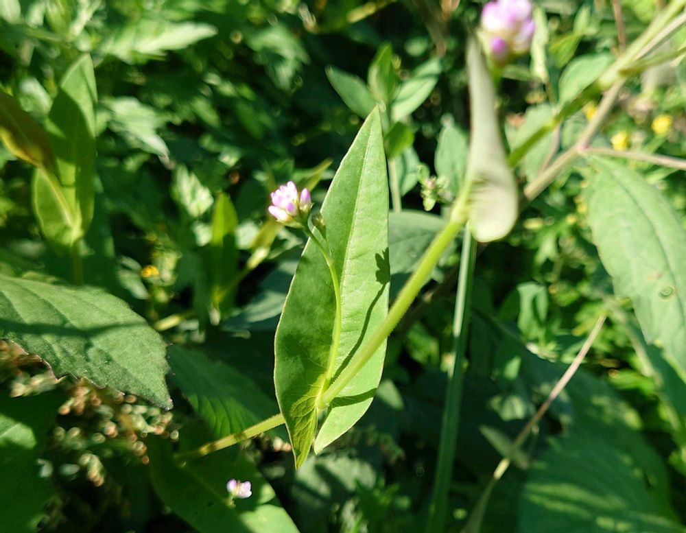 0.5~4cmの柄があり基部は深い心形~矢じり形となり茎を抱くように張り出す(上部では無柄となることもある)