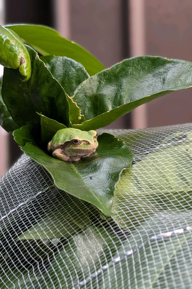 4️⃣シークワーサーの木のてっぺんの葉に主みたいに🐸ちゃんいたよ😅🐸ちゃん飛んで来ないかドキドキの写真でした🫣
