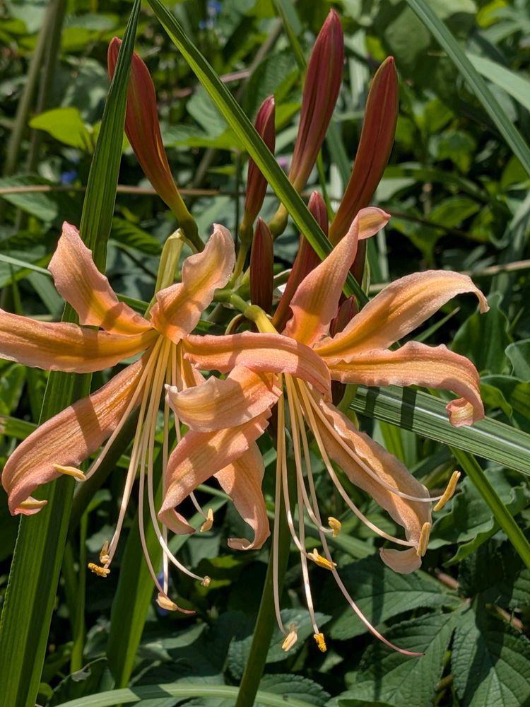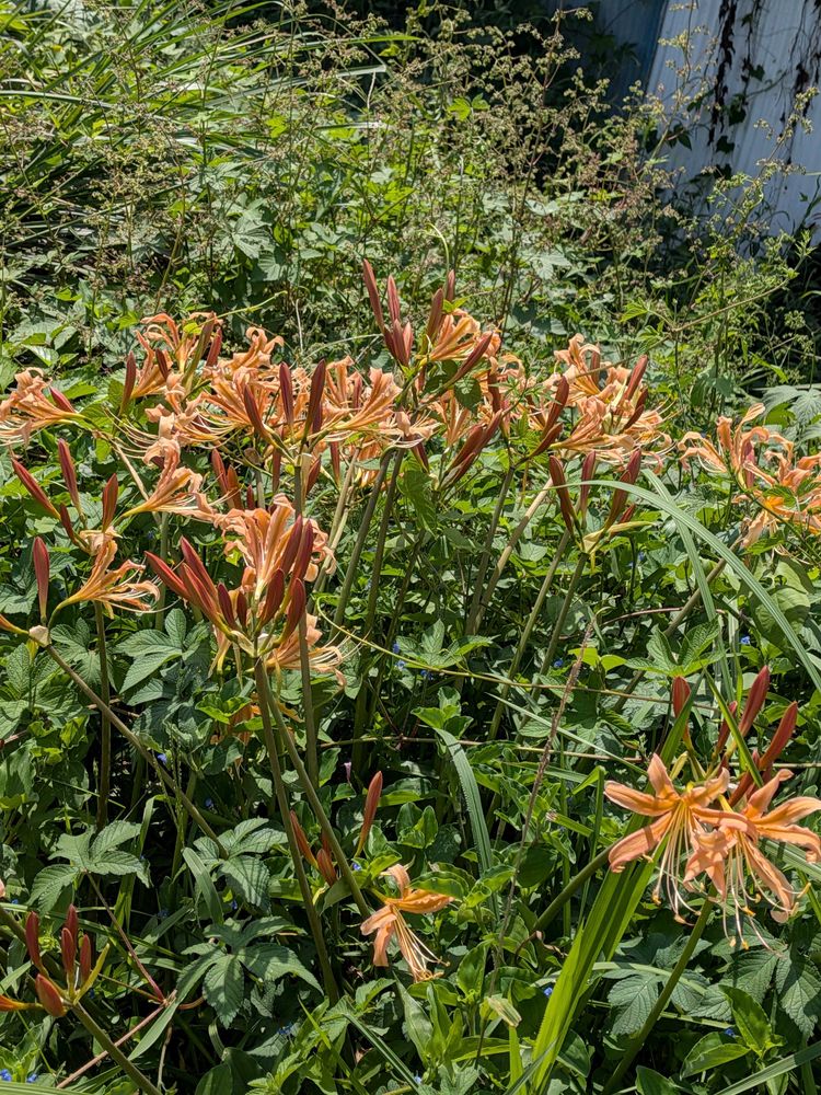 田んぼ横の土手に変わった色のリコリスが咲いていました。誰かが植えたのかな?