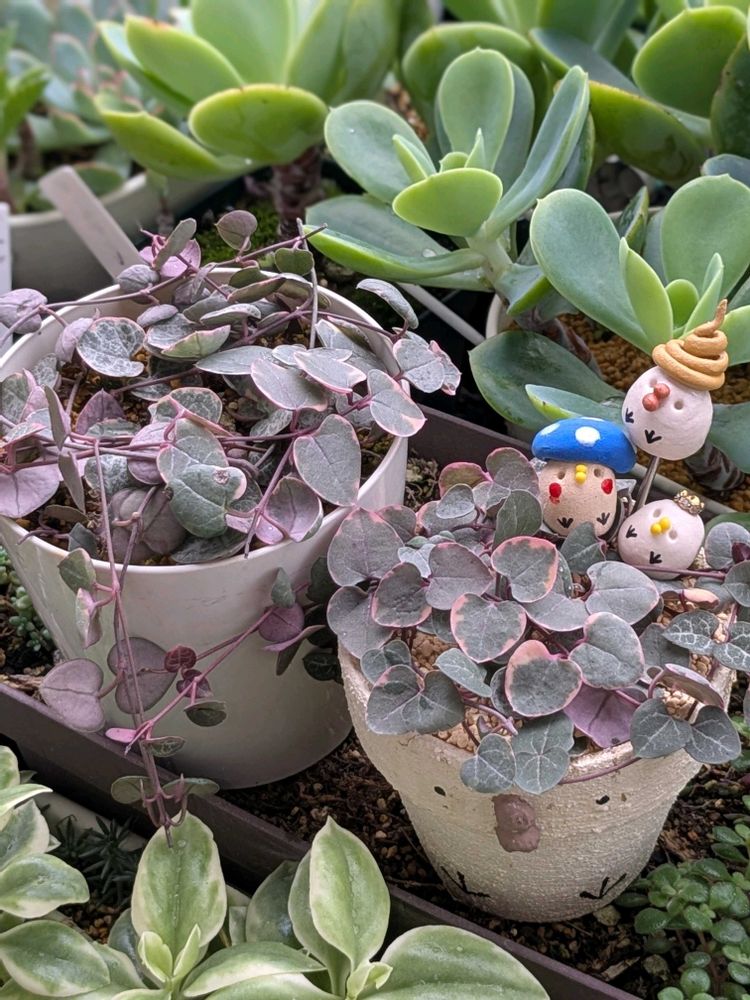 ④斑入りハートカズラさん❣️左の鉢がいっぱいになって来たから、ピータン鉢にも植えてみたよ〜✨(*^^*)