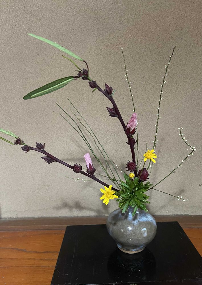 庭で咲いている花を、手作りの花瓶に飾りました。(ローゼル、白ミズヒキ、ユリオプスデージ)