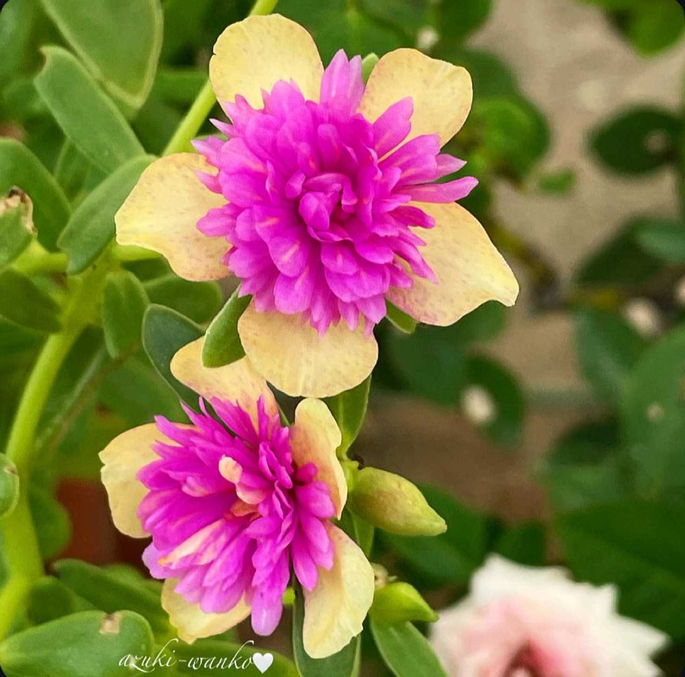 これが八重咲きポーチュラカ・花火ですか。花弁の内と外で色が違う・・・綺麗ですね😍。