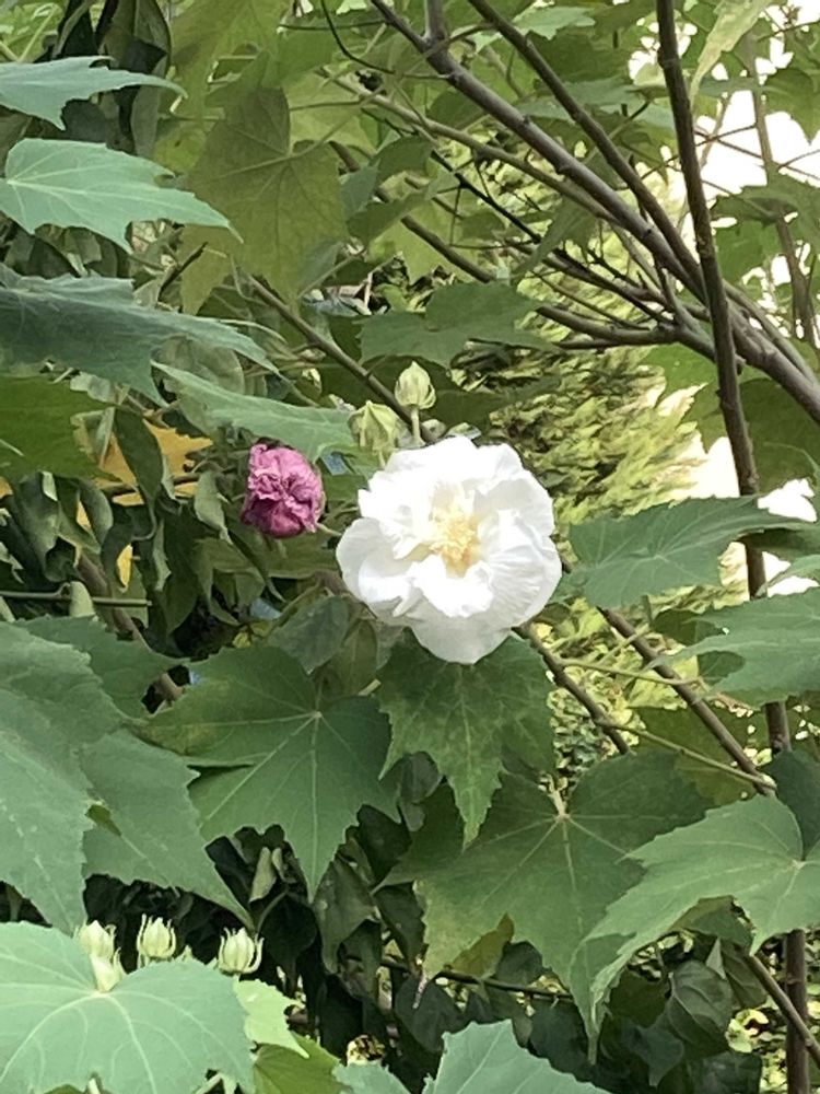 朝の白い芙蓉の横に咲き終わった花柄の色が赤いのに気がついてもしかして酔芙蓉かも、と思い夕方もう一度見に行ったのです