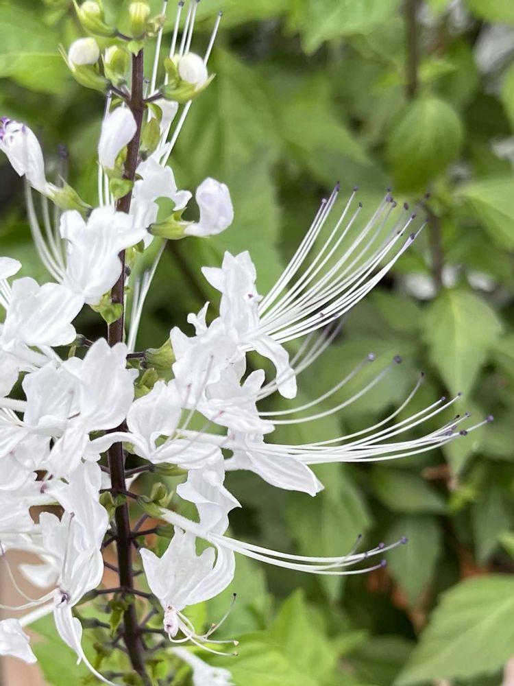 雄しべや雌しべが長く伸びる花の形状が猫のヒゲを思わせます。よく見るとヒゲの先に紫色がポツっと付いてますね!