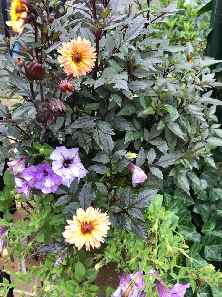 寄せ植えの地上部分は99%プチダリアのもの、ペチュニアが申し訳無さそうに鉢から垂れ下がっている。。。