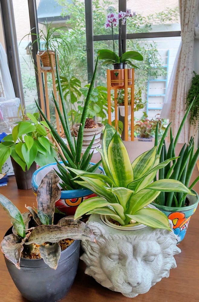 初めて見た銅葉色のサンスベリアが仲間入り。4種類となりました。葉っぱが硬い。