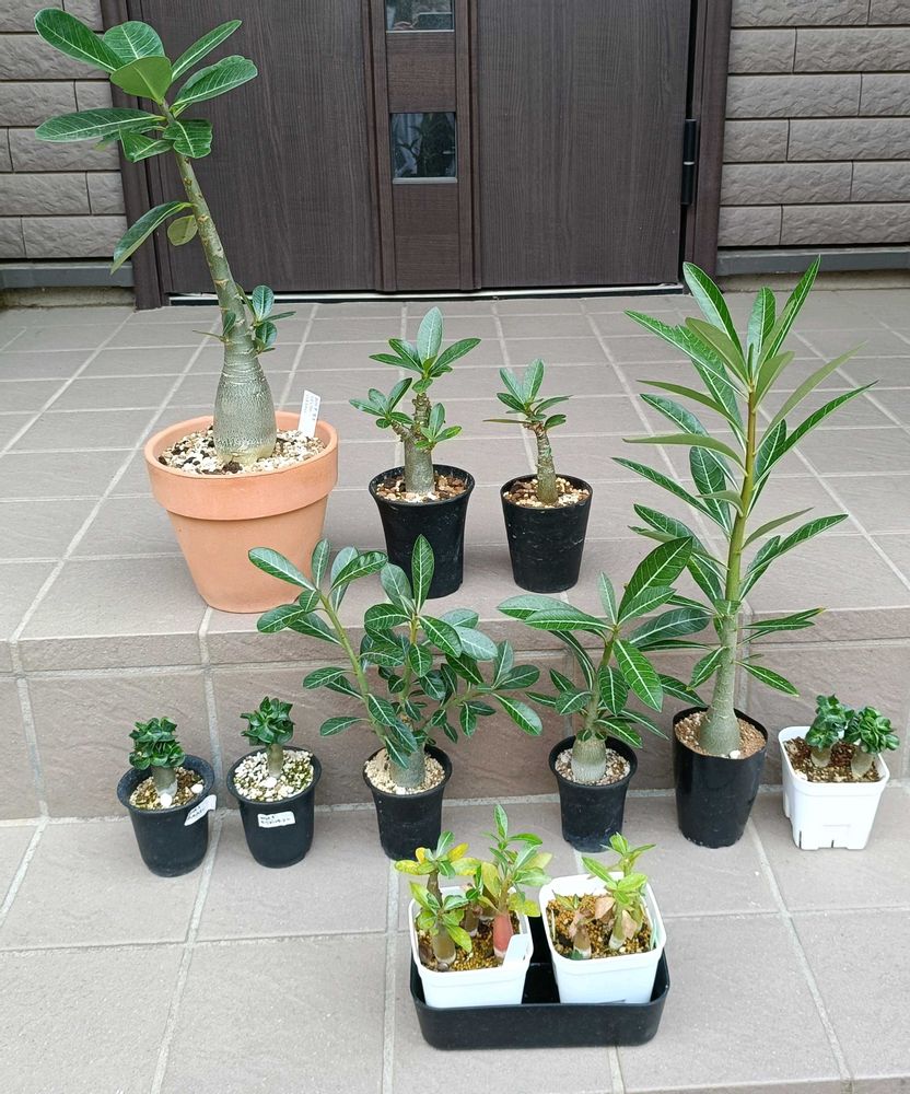真ん中の列の6鉢は去年蒔いたもの。普通葉は、「アデニウムmix」という名で購入したので種類は不明。獅子葉はペッチパンランとモングガットサーマンです。