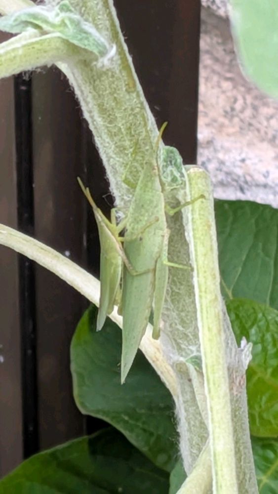 ⑤ヒマワリの茎におんぶバッタがとまっているのを発見!