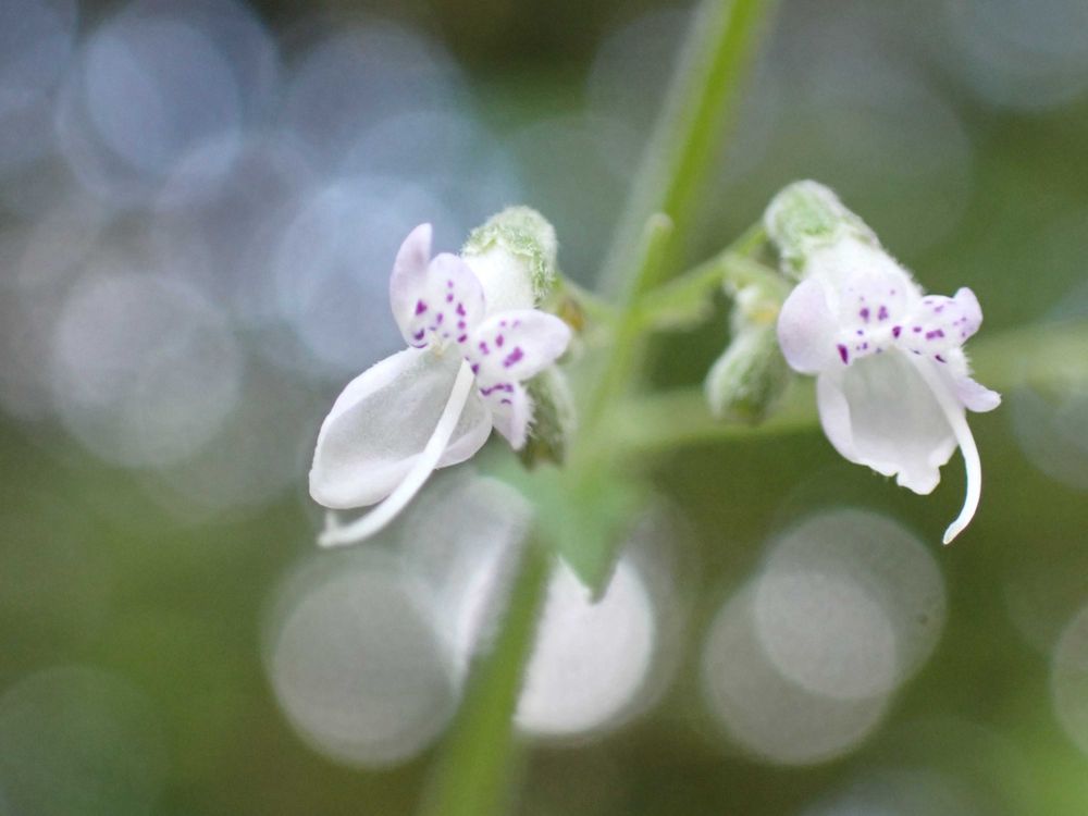 花は、上に立ち上がる花びらには斑点がありました。私が見たヒキオコシは、白い色でした。淡い紫色と言ってもいいかな。雄しべ雌しべが花びらより先に出ています。