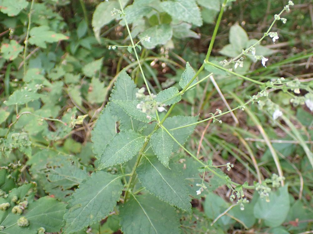 下のほうの葉は、ヤマハッカと同じように、葉の柄に小さなひれがついていました。(④)