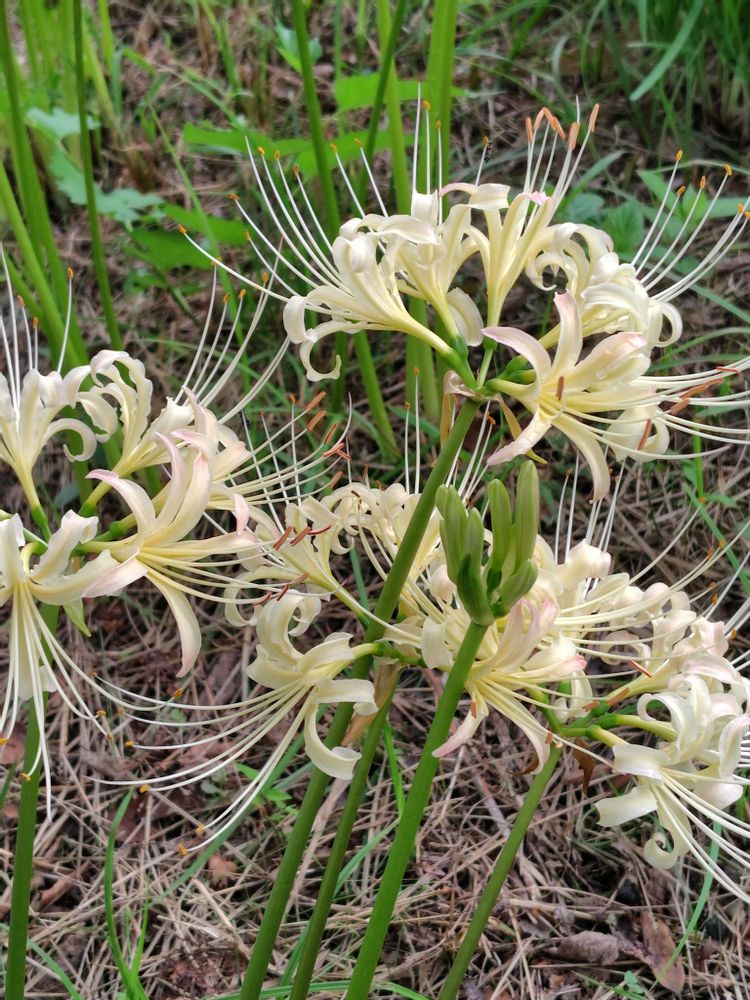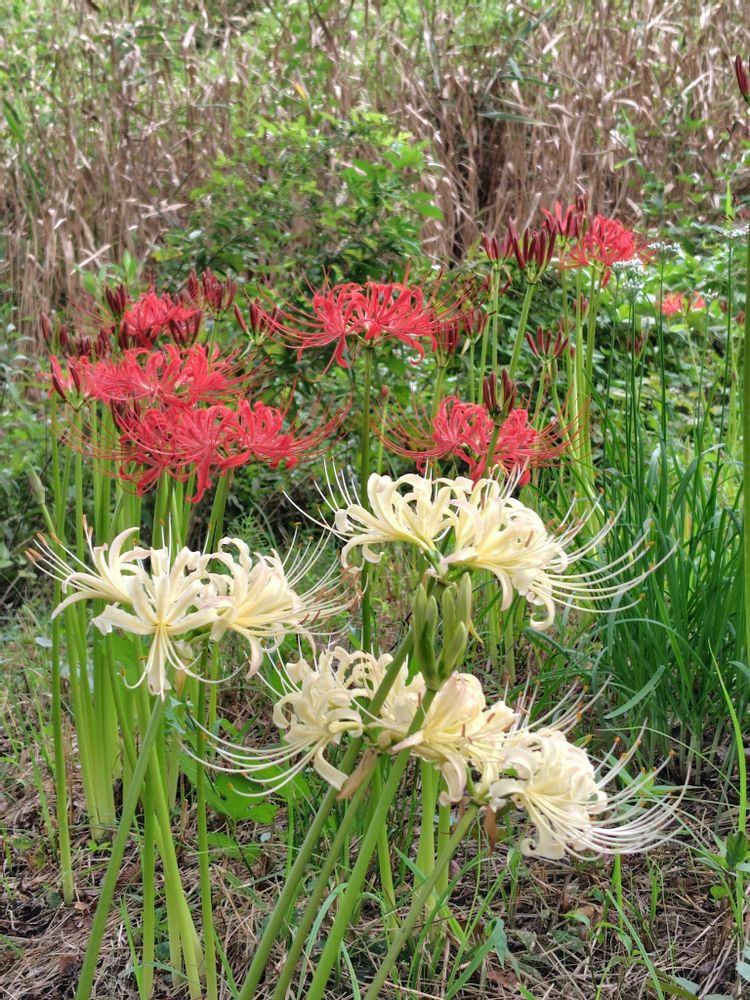白を植えた覚えがないのです🙄…数年前自分では移動出来ない大鉢に赤を植えていました 木洩れ日の下、休眠したらしいし手入れも余り…でしたが暫く眠っていたようで(数年間)生き延び今年数株咲きました 驚いた事に赤色では無くクリーム色がかった白の花です (付近にはヒガンバナはないですが、雑種なのですか??)