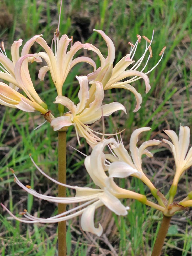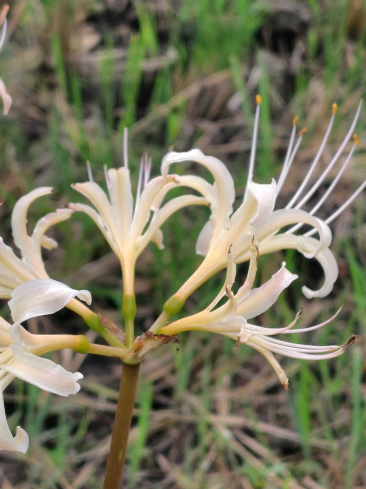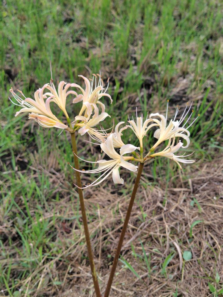 これはヒガンバナの白花種ではなく、暖地に見られるショウキズイセンとヒガンバナの雑種である。