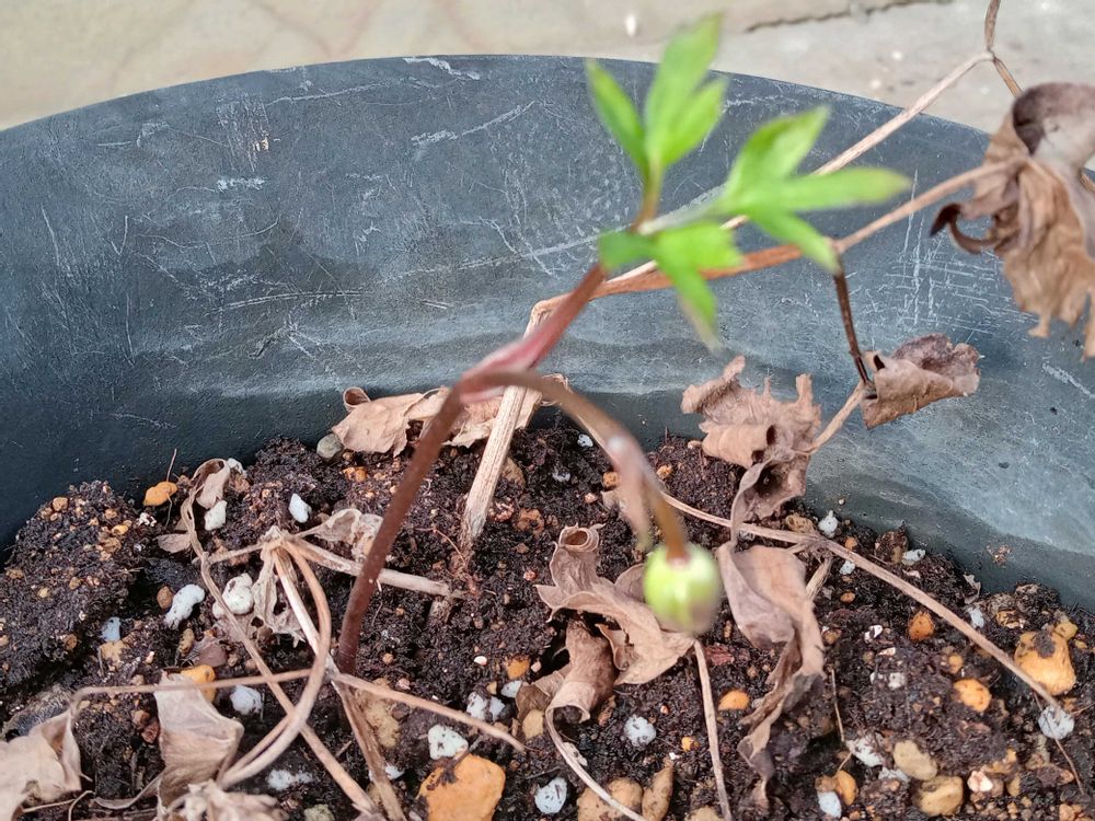 枯れた葉の中からピヨ~ンと伸びた葉の先に蕾が~💚