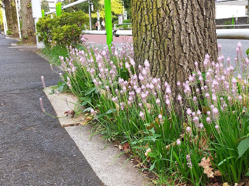 モミジバフウの並木道、なぜかこの 1箇所だけツルボが ワサワサ 群生してました。