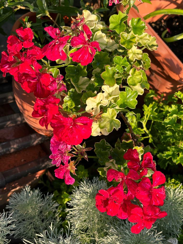 ④葉っぱ🌿の濃淡💚🤍に浮き立っているアイビーゼラニウムの赤いお花❤️もどんどん咲いてきました。