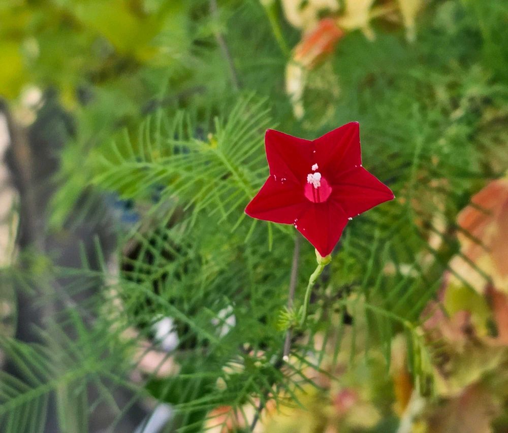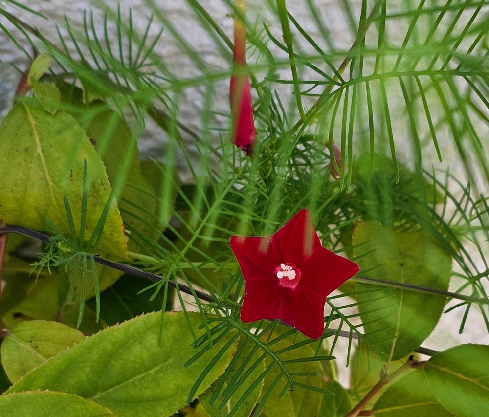 その花の背景となるルコウソウの葉はシダのように細かく分かれて 細い茎が他の草木に絡み付き