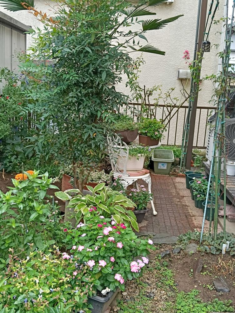 手前のプランターの日々草は、8月の初旬に元気になってきて植え替えをしてから、連日38℃の日が一週間近くあった日も水やりせずに、ほぼ地植え組と一緒で、恵みの雨で元気に育っている☔✨