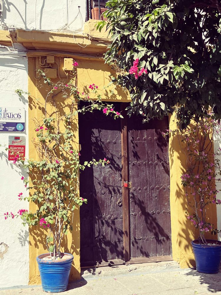 スペイン コルドバ 門扉周りが鮮やかな黄色🟨両サイドに青の🟦植木鉢にブーゲンビリア。
