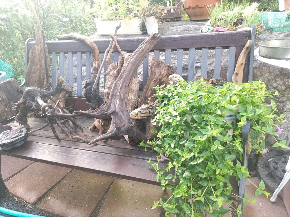 息子が拾ってきた流木。満開を見たいスーパートレニアカタリーナ。