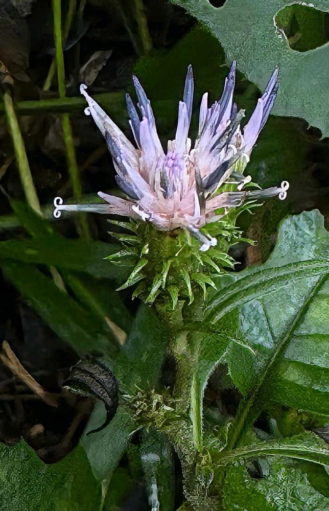花は直径2cm位の頭花で茎の上部に淡紫色の花を数個付け、総包は1.8cm位の釣り鐘形で先が尖っています。