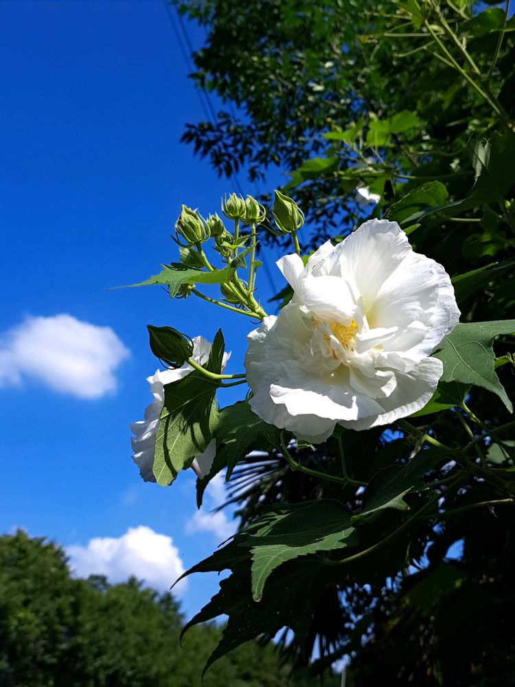 真っ白な酔芙蓉が青空に映えて素敵な一枚ですね✨
