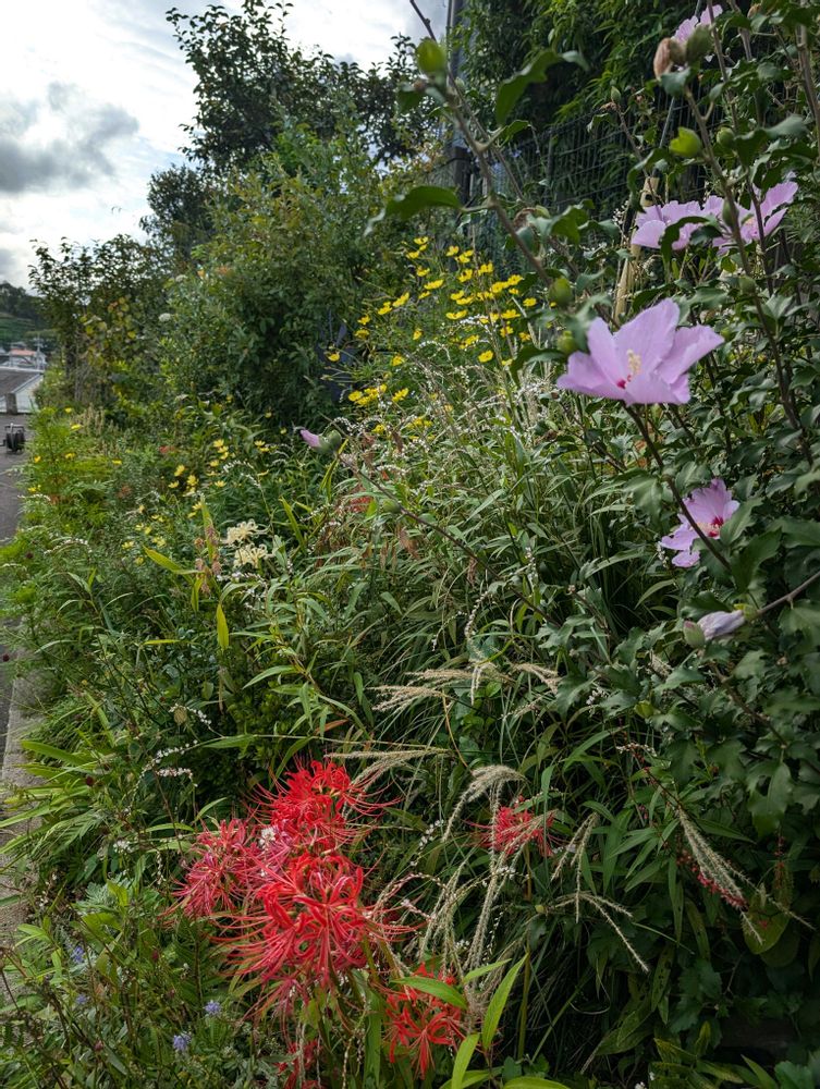 ①②カリガネソウ③④サクラタデ ヒガンバナ⑤モミジアオイ