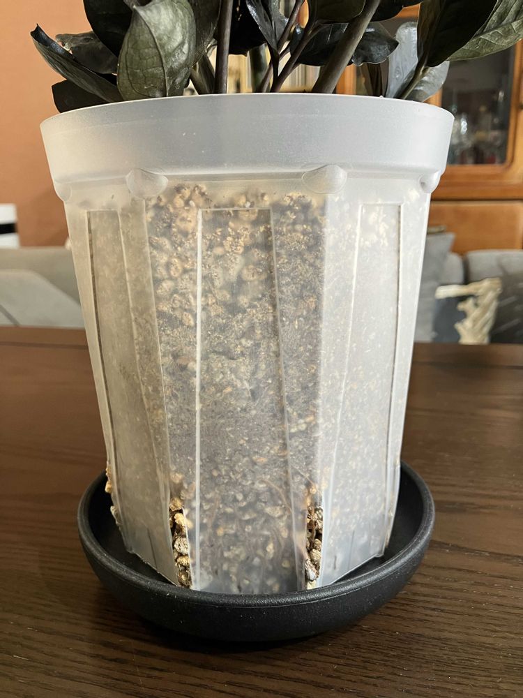 20日ぶりに水やりするのに鉢カバーから出してみたら、スリット鉢が盛り上がるほどパンパンに‼️