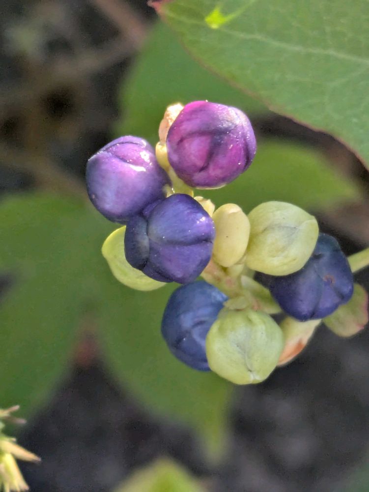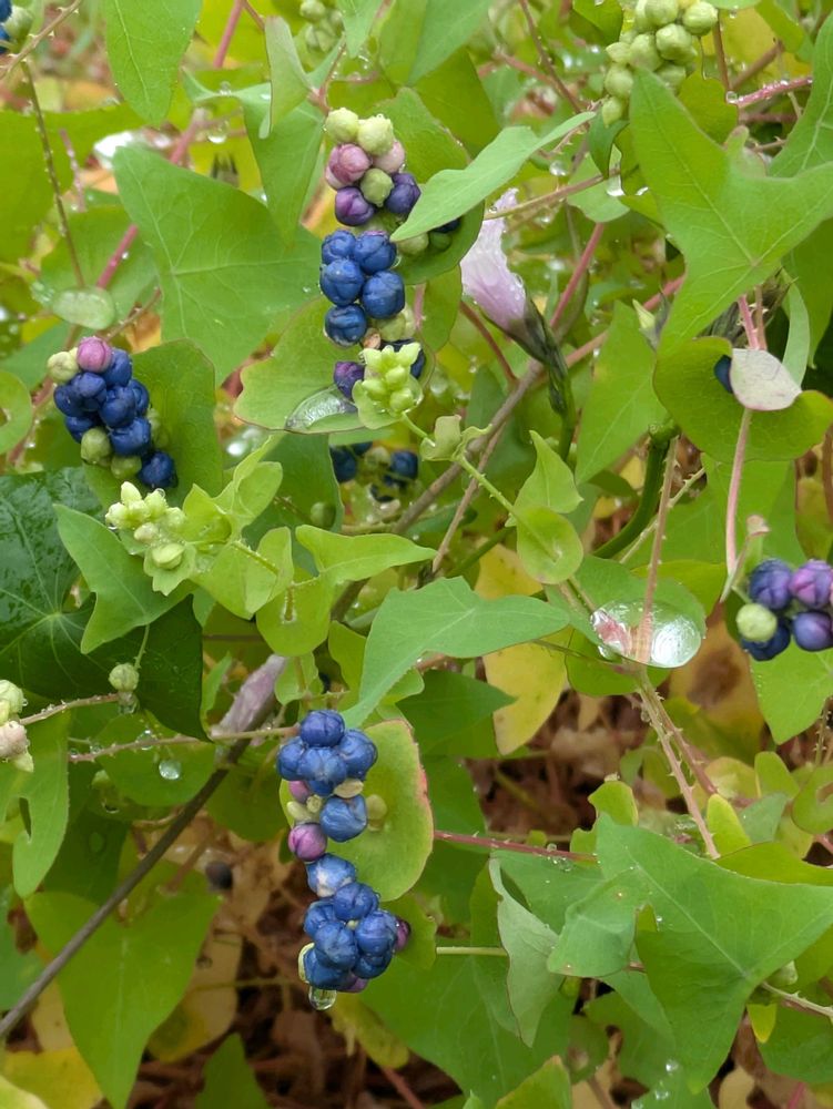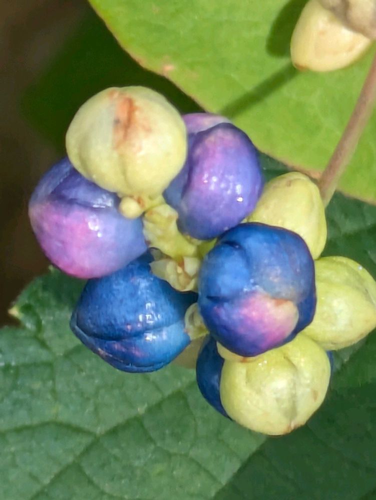 白い小さな花はそのまま多肉質になってそう果を包み、直径3~4㍉の球形になり、白から紅紫、青紫と変わっていきます。