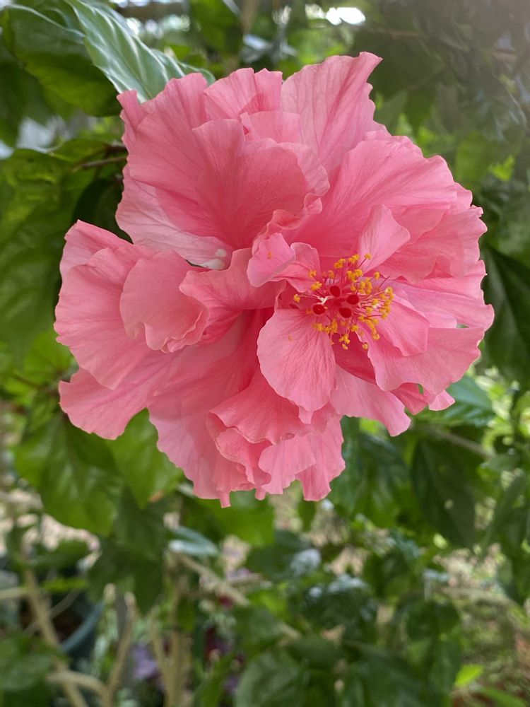 優しいピンク色🩷の花びらが複雑に混み合いフリフリが可愛い八重咲きハイビスカスです🌺久々に薄ピンク色🩷フリフリ感がたまらなく可愛いです💕👗🍃🩷🍃🩷🍃