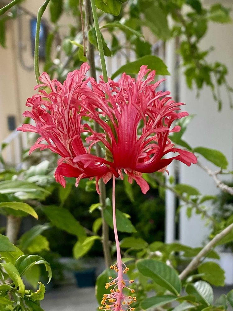 赤い花弁が細かく切れ込み…反り返る花はまるで風鈴のよう〰️風に揺れ涼しげです💕🌿🎐🌺🎐🌿