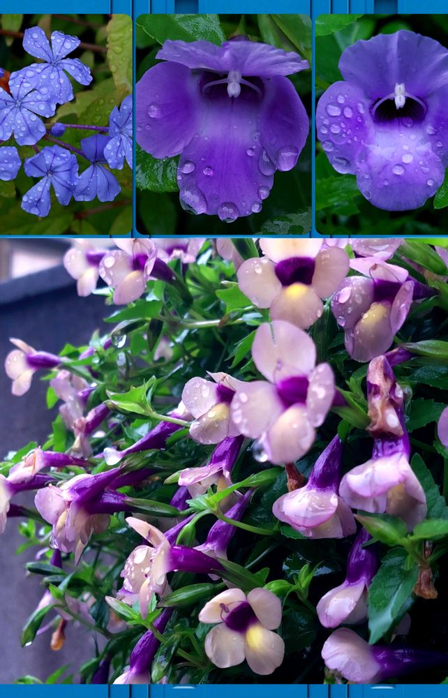 ②枚目…今日の庭と玄関アプローチ(塀)の💙💜のお花たち😉🎶